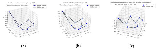 Comparing the two grinding paths, it can be observed that the path optimized by the ACO algorithm is 10% shorter than the path that was not processed. At the same grinding speed, a shorter path means a reduction in the grinding time, thus improving the grinding efficiency and extending the service life of the mechanical arm. In addition to the ACO algorithm, the TSP problems can be solved using classical intelligent optimization algorithms such as PSO, GA, and SA. Using the control variable method and setting the same number of iterations; the optimal settings can be selected by parameter comparison to obtain the grinding trajectories of PSO, GA, and SA, as shown in Figure 26.