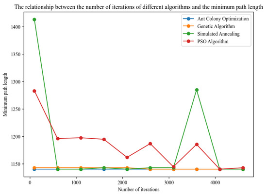 The relationship between the number of iterations of four intelligent optimization algorithms and the minimum path length.