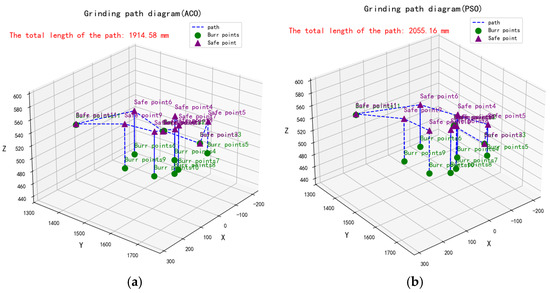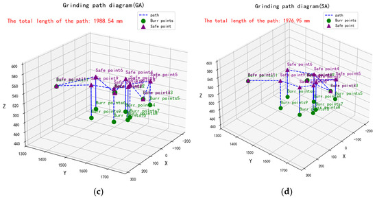 In view of the possibility of collisions between burr points, we set safety points for each burr point. After combining the traversal order of the grinding burr points and the safety points, the calculated total grinding path is shown in Figure 28. This shows the trajectories planned by ACO, PSO, GA, and SA, as well as the grinding paths after adding the safety point coordinates. Among them, the ACO algorithm still obtains the optimal trajectory at this point, i.e., the total path length obtained by the ACO algorithm remains the shortest.