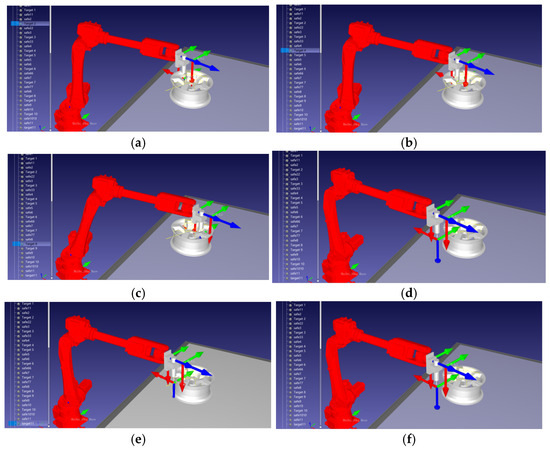 The trajectory of the mechanical arm can be divided into PTP (Point to Point) and CP (Continuous Path) these two modes. In RoBoDK, the grinding head may pass through the wheel hub casting if the grinding points are traversed directly using a PTP trajectory. Hence, to better complete grinding, the CP mode is used in this experiment. This mode specifies the start and end points and includes several intermediate path points between them. The ACO algorithm was selected to determine the optimal order of grinding points, resulting in the sequence [4, 7, 8, 10, 9, 11, 6, 1, 2, 3, 5]. When safety points are set during the simulation, the actual grinding trajectory is shown in Figure 30. The grinding program consists of one approach point, one retract point, 11 burr target points, and 22 safety points. The robot initiates its movement from the approach point to the first target point in a coordinated motion. It then traverses the remaining target points and safety points in a linear motion, culminating in a return from the final target point to the retract point, completing the full motion trajectory.