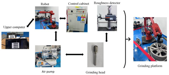 For grinding robot technology, foreign grinding robot technology dates back to the 1950s when industrial developed countries began applying automatic control technology to grinding. By the end of the 1970s, Japan began research into mechanical arm polishing and grinding. Subsequently, the United States, Germany, South Korea and other countries conducted extensive research on factors such as grinding force, speed, feed rate, path, material removal rate, etc. Moreover, they established mathematical models of grinding force and developed related grinding equipment, thus laying the foundation for automated grinding. For example, Villagrossi et al. from Danieli Metallurgical Equipment Co., Ltd. in Italy [2] have developed a grinding robot for hard materials that optimizes the trajectory by means of single-axis force sensor feedback in order to avoid elastic effects on the system structure. In recent years, domestic enterprises, universities, and colleges have increasingly focused on the research and development of grinding robots. Du from Dalian University of Technology [3] designed a multi-axis robot processor that effectively avoided vibration and collision and achieved good polishing results by using a flexible end device and force feedback sensors to polish titanium alloy surfaces. Hong et al. from the National Center University [4] integrated robotic arms into the electrochemical mechanical polishing of titanium alloys and improved surface smoothness and corrosion resistance with a new grinding head. Researchers from Universidad Politecnica de Valencia applied the theory of topology to optimize the robot path and reduce the path length during the grinding process through trajectory planning [5,6]. Guo et al. [7] from Chang’an University developed a robot for removing welds at the ends of welded pipes and verified its superiority and planning reliability. While researching the grinding of sheet metal, Sean et al. [8] calculated the contact area using the Hertz theory and adopted the finite element method to solve the problems of deformation caused by the contact force, thus ensuring a uniform polishing of the surface.