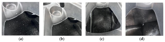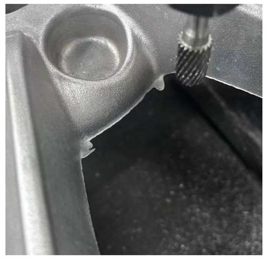 Three experiments were conducted on several burr positions on the wheel hub casting. The grinding spindle speed was set at 200 rpm, 400 rpm, 600 rpm, and 800 rpm. The grinding effects at three representative positions are shown in Figure 34.
