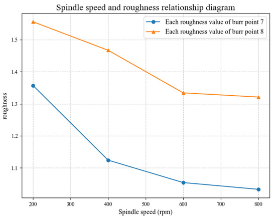 A critical indicator of burr grinding quality is surface roughness. Due to the uneven distribution of the burrs, the grinding results can vary even if the axial cutting depth is kept constant. In the actual grinding process, comparative experiments were carried out with a fixed cutting depth, mainly focusing on exploring the effect of spindle speed on the grinding quality (i.e., surface roughness). The experimental setup was as follows: while other variables, such as cutting depth and force, remained unchanged, the spindle speeds were set at 200 rpm, 400 rpm, 600 rpm, and 800 rpm. By analyzing the roughness of the burrs ground at different spindle speeds, the most suitable grinding spindle speed was identified. This speed increased grinding efficiency while maintaining quality. Figure 33 shows the burr points targeted for grinding.