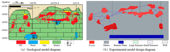 Weathered crust reservoirs are a typical type of carbonate reservoir developed in marine petroliferous basins worldwide [1,2]. They are formed by long-term exposure on the surface, resulting in dissolution by meteoric water infiltration, forming a highly heterogeneous network of caves, fractures, and vugs [3,4,5,6]. This complex fracture cave system makes it challenging to efficiently develop remaining oil reserves in these reservoirs [7]. After waterflooding, large amounts of remaining oil are trapped and bypassed in unswept zones due to reservoir heterogeneity, presenting a great potential for enhanced oil recovery (EOR) [8,9,10]. Therefore, it is of great theoretical and practical significance to carry out research on the remaining oil distribution characteristics and EOR measures in this type of reservoir.