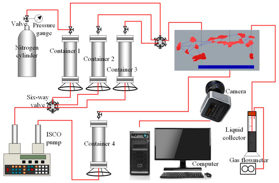 Under the guidance of the similarity criterion, the experiment was carried out at 25 °C and 101 kPa. We utilized aviation kerosene colored by Sudan III as a substitute for underground crude oil, and we used distilled water colored by methyl blue and nitrogen gas as the injection agents. In the experiment, bottom water injection was used to simulate bottom water drive oil recovery, while water or gas injection in injection or gas injection wells was used to simulate water and gas injection oil recovery. The experimental set-up was built using an ISCO pump, a nitrogen cylinder containing nitrogen, four intermediate containers, a pressure gauge, a camera, several valves, etc., as shown in Figure 3. During the experiment, oil and water production at different time periods was detected by the oil and water metering device, and the distribution of oil, gas, and water during the oil displacement process was captured in real time using the camera.