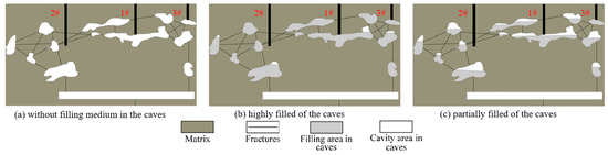 Take Well 1# as the production well for example. When the bottom water enters a cave from the bottom of the cave, a part of the water will flow along the fractures and other caves to the production well. However, due to the gravity difference between oil and water, there is always a distinct oil–water interface, which is most obvious when the cave does not have filling medium. The height of this oil–water interface can reflect the flow characteristics of oil and water. The oil–water distributions in the entire model under different filling modes when bottom water just entered Cave XI are shown in Figure 6.