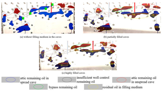 For the spread range in the spread caves, when the caves were partially filled or highly filled, the oil displacement effect in the lower half of the filled area was significantly higher than that in the upper half. This was due to the rapid upward surge of bottom water when close to the cavity area. This remaining oil can be called “residual oil in filling medium”. When the caves were large in size and the thickness of the filling area was low, after bottom water entered the cave, it surged rapidly into the cavity area, resulting in a very small spread range in the filling area, as shown in Caves V and VIII in Figure 8b.
