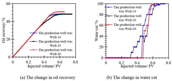 The production curves of the weathered crust reservoir during bottom water flooding under different production well locations when the filling mode was partial filling are shown in Figure 11. According to Figure 11a, since the differences in the number of spread caves and the spread range in each cave under the three well locations were small, the recovery rates were all between 48.3% and 50.9%. According to Figure 11b, although the remaining oil distribution differences after bottom water flooding under the three well locations and the recovery rates were not very different, there were differences in the types of fracture cave connections communicated with the wells under the three well locations, and the water cut change curves differed greatly. When the production well was Well 2#, the water breakthrough time was the earliest, the simultaneous oil and water production period was the longest, and the production time was also the longest. This was because the well was located in the fracture, so bottom water surged into the bottom of the well quickly, causing early water breakthrough in the production well. With multiple fractures communicating with the production well, oil and water were produced simultaneously for a long time.