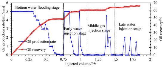 By measuring the amount of oil and water produced from the production well, the real-time oil recovery and water cut were calculated. The oil recovery was calculated using the following formula: