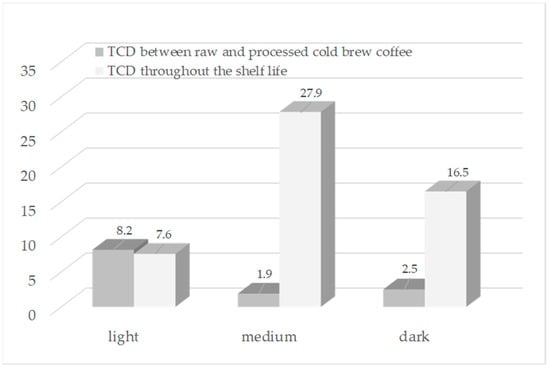 The greatest color difference (8.2), resulting from pasteurization at 95 °C/15 s, was observed in the light roast drink, and the smallest (1.9) in the medium roast. Bernat et al. [46] state that TCD less than 3 cannot be easily detected by human eyes, and values greater than 12 represent different colors; therefore, pasteurization played a noticeable impact on the light CBC’s color only. Over the shelf life study, a meaningful variation was observed in all samples; the greatest difference (27.9) was found in medium roasted drink, followed by dark and light. Lopane et al. [13] discussed that change in beverages color over storage may be associated with increases in acidity and non-volatile compounds, such as melanoidins and/or chlorogenic acid.