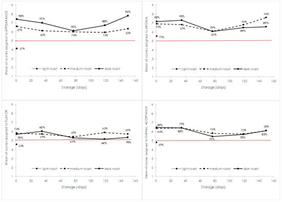 Figure 2 exhibits the mean scores assigned to the appearance, aroma, flavor and overall acceptance of light, medium and dark CBC throughout the shelf life study. The percentage of scores greater than 5 (percentage of acceptance) in the 9-point hedonic scale is also presented.