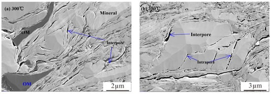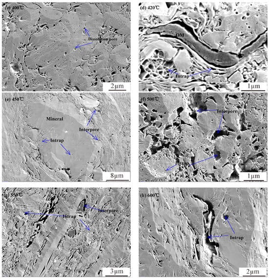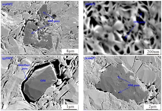 The OM contained few pores, such as those between the OM and mineral interface and the primary pores inside the OM particles (Figure 2a). Overall, the OM had almost no pores, indicating that many OM pores probably need to be created in the process of converting kerogen to oil and gas (Figure 2a–h). The samples heated to temperatures of less than 400 °C revealed that the OM pores were primary pores in the OM, and some pores were probably produced during the process of converting OM to kerogen. Large and round bubble-like OM pores appeared in the sample that was pyrolyzed at 450 °C (Figure 2e), possibly indicating the beginning of gas generation and the presence of pores associated with oil drops and gas escape [6,12,17,19,40]. At the same time, spongy OM pores were observed in the samples with temperatures greater than 400 °C (Figure 2d–h), and some shrinkage OM pores and microfractures were discovered in the samples, possibly due to hydrocarbon expulsion [17,19,40].
