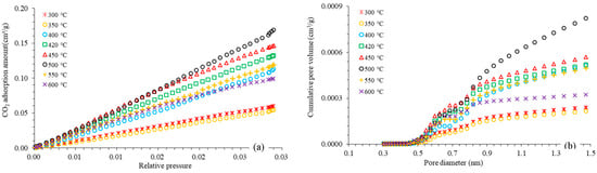 The CO2 adsorption capacity increased with increasing pyrolysis temperature and ranged from 0.11 to 0.34 cm3/g. The CO2 adsorption capacity of the sample at 350 °C was the lowest, at 0.11 cm3/g, and that of the sample at 500 °C was the highest, at 0.34 cm3/g (Figure 3a, Table 3). The sample with the lowest micropore volume, 0.22 mm3/g, was produced at a pyrolysis temperature of 350 °C, and the sample with the greatest micropore volume, 0.82 mm3/g, was produced at a pyrolysis temperature of 500 °C (Figure 3b, Table 3). The pore volume rapidly increased between 0.5 and 0.9 nm in diameter for all samples; however, the samples pyrolyzed at 500 °C had more pores with diameters greater than 0.9 nm, and the cumulative pore volume still increased rapidly when the pore diameter was greater than 0.9 nm (Figure 3b). Overall, the shale pore volume increased with increasing thermal level, peaked at 500 °C, and then decreased. OM pores and mineral pores both clearly increased with increasing thermal maturity (Figure 1a–h and Figure 2a–h). OM pores typically have a relatively small pore diameter according to marine shale observations [6,12,17,19,40], and as a result, we infer that the micropores predominantly consist of OM pores. The SSAs ranged from 0.55 to 1.97 m2/g on the basis of the CO2 sorption data (Table 3 and Table 4), which was much lower than the SSA of marine shale micropores, and the micropore SSA in marine shale typically accounts for 60% of the total shale SSA [6,15,20,41].