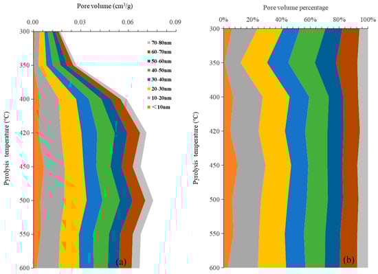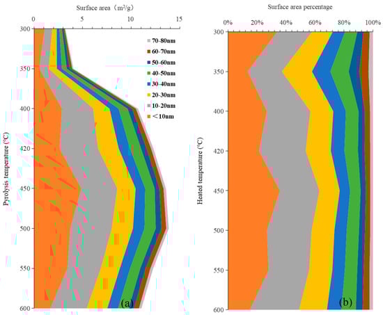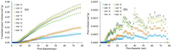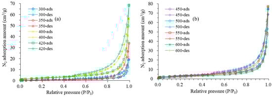 The sample N2 experimental isotherms consisted of adsorption and desorption lines, which did not completely coincide and exhibited a hysteresis loop. The figure shows the type H3 hysteresis loop based on the N2 curves with increasing thermal maturity (Figure 4a,b), indicating that the pores were mainly open slits and conical holes and that these pores had good connectivity, which was consistent with the FE-SEM observations (Figure 1a–h and Figure 2a–h). The N2 sorption capacities ranged from 202.97 to 819.22 cm3/g, and the mean was 625.98 cm3/g; the lowest value was from the sample with a pyrolysis temperature of 300 °C, and the highest value was from the sample with a pyrolysis temperature of 450 °C (Figure 4a,b).
