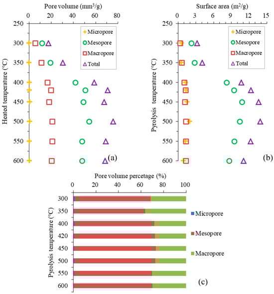 Pore volume and surface area evolution with increasing thermal maturity induced by pyrolysis. (a) Pore volume variation of micropores, mesopores, macropores, and total pores; (b) surface area; (c) pore volume ratios.