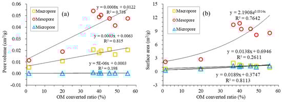 - The converted OM rate strongly influenced the mesopore volume, macropore volume, and SSA of micropores and mesopores.