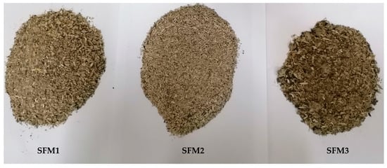 Based on the analysis of the GMD of the starting and ground SFMs (Table 3), it was evident that grinding, with both mills, significantly reduced particle size in all analyzed SFM samples. Regarding bulk density, grinding of SFM1 and SFM2 with the hammer mill (SFM1:HM and SFM2:HM) resulted in a significant increase in this parameter. However, subsequent grinding with the roll mill (SFM1:RM and SFM2:RM) reduced the bulk density to a level comparable to the initial samples SFM1 and SFM2. In the case of SFM3, a significant decrease in bulk density was observed only after grinding with the roll mill (SFM3:RM).
