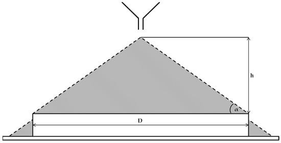 where α° stands for the angle of repose (°), h (cm) is the height of the cone formed by material, while D (cm) is the diameter of the base of the cone (Figure 2).