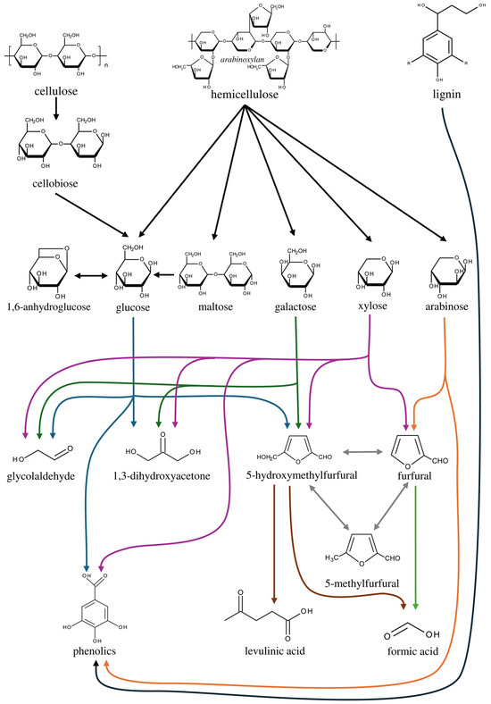 - Rasmussen, H.; Sørensen, H.R.; Meyer, A.S. Formation of Degradation Compounds from Lignocellulosic Biomass in the Biorefinery: Sugar Reaction Mechanisms. Carbohydr. Res. 2014, 385, 45–57. [Google Scholar] [CrossRef] [PubMed]