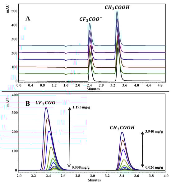 Chromatographic method by RP-HPLC (Synergi Hydro-RP® C-18 column) to trifluoroacetate and acetic acid analysis. The signals for trifluoroacetate anion (tR = 2.4 min) and acetic acid (tR = 3.4 min) are observed. (A) Overlay of chromatographic profiles to determine the suitability of the method with respect to tR and peak area (n = 6). (B) Superposition of the chromatographic profiles for the construction of the calibration curves to quantify the trifluoroacetate anion and acetic acid . The colour lines correspond to the concentration levels see Section 2.5.