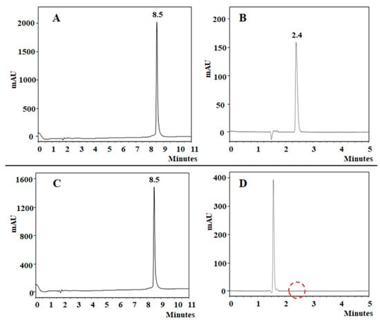 Evaluating HCl concentrations, a similar behavior was observed, where it was only necessary to repeat the process twice to exchange the counterion trifluoroacetate for hydrochloride. After, the reaction time was evaluated by dissolving the 1-TFA peptide (2.3 mg/mL) in 0.02 M HCl and stirring the RM at different times (0.5, 1, 2, 3, 4, and 5 min), and then the RM was frozen at 20 °C and lyophilized; the process was repeated twice. The trifluoroacetate counterion of peptide 1-TFA was removed completely in all reaction times evaluated, indicating that it only necessarily treated the peptide 1-TFA with 0.02 M HCl by 30 s at RT. Once the reaction time needed for the counterion exchange was evaluated, the peptide concentration was evaluated (0.5, 1, 2, 5, and 10 mg/mL), maintaining constant the conditions previously optimized: 0.02 M HCl, reaction time 30 s, and the process was repeated twice. The results showed that the trifluoroacetate counterion was eliminated when the peptide concentration was 0.5, 1, 2, or 5 mg/mL. When the reaction was carried out with peptide 1-TFA at 10 mg/mL, the chromatographic profile of the 1-HCl peptide showed a small signal at tR = 2.4 min corresponding to the remaining trifluoroacetate counterion, therefore showing that at this concentration there is not a total exchange of the trifluoroacetate counterion for hydrochloride. According to the results, the optimized method to exchange the counterion trifluoroacetate for hydrochloride is as follows: the peptide (5 mg/mL) is dissolved in 0.02 M HCl and stirred for 30 s at RT, and then the RM is frozen at −20 °C and subsequently lyophilized; this process must be repeated two times. The peptides were analyzed by RP-HPLC, LC-MS, and FT-ATR (Figure 2, Figures S3, and S4 (Supplementary Materials)) to quantify the counterion and establish if the HCl treatment affects the integrity and identity of the peptides. As an example, Figure 2 presents the analysis of peptides 1-TFA and 1-HCl by HPLC using C-18, a monolithic and polar embedded column.