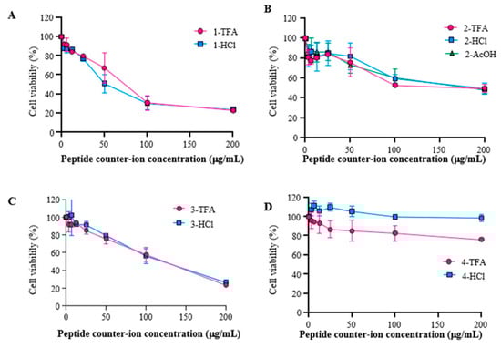 Cytotoxic effect of peptides in breast cancer cells (MCF-7). Cytotoxic effect of (A). Peptide 1, (B) peptide 2, (C) peptide 3, (D) and peptide 4 against the MCF-7 cell line. The cells were treated with the peptides for 2 h at 37 °C. The data represent the mean ± SD (n = 3); 2-way ANOVA and t-test were used, p ≤ 0.05, showing (a) statistically not significant differences between 1-TFA, 1-HCl, and 1-AcOH peptides, (b) statistically not significant differences between 2-TFA and 2-HCl peptides, (c) statistically not significant differences between 3-TFA and 3-HCl peptides, and (d) statistically not significant differences between 4-TFA, 4-HCl, and 4-AcOH peptides.