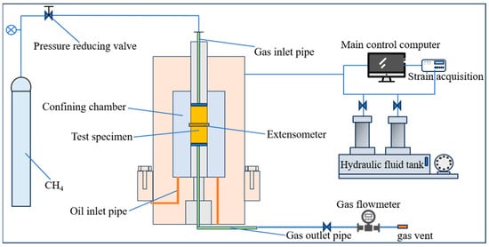 In this experiment, the self-developed thermal fluid–solid coupling triaxial seepage test system for gas-bearing coal and rock developed by Chongqing University was used (Figure 1). The maximum axial pressure of the equipment is 500 MPa, the maximum confining pressure is 60 MPa, and the maximum seepage pressure is 6 MPa. The deformation measurement includes axial deformation and radial deformation. The allowable maximum axial displacement is 60 mm, and the maximum radial displacement is 6 mm. The measurement accuracy range of axial pressure and confining pressure is ±1%. During the test, the relevant parameters such as axial pressure, confining pressure, seepage pressure, axial deformation, and radial deformation can be dynamically monitored in real time.