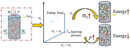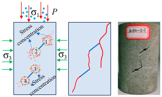 The results show that the influence of seepage pressure P on crack propagation and penetration is mainly determined by the external stress σ and seepage pressure P. The existence of seepage pressure P causes additional expansion stress in the rock sample, resulting in a tensile stress zone at the crack tip (Figure 24) [38]. According to the fracture theory, the effect of seepage pressure P is equivalent to the tensile stress acting on the strength of rock. If the tensile stress generated at the crack tip of the specimen exceeds its tensile strength, the crack will expand and extend. The compressive strength of the sample is much higher than the tensile strength. Under the action of the seepage pressure, the friction force between the particles in the sample decreases, resulting in loose particles or shedding of the connection between the particles. A new crack network is generated, which aggravates the crack propagation of the sample.