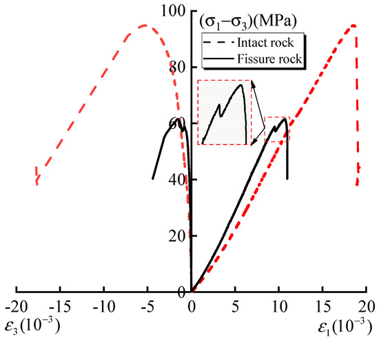 Stress–strain curves of the intact rock and fractured rock.