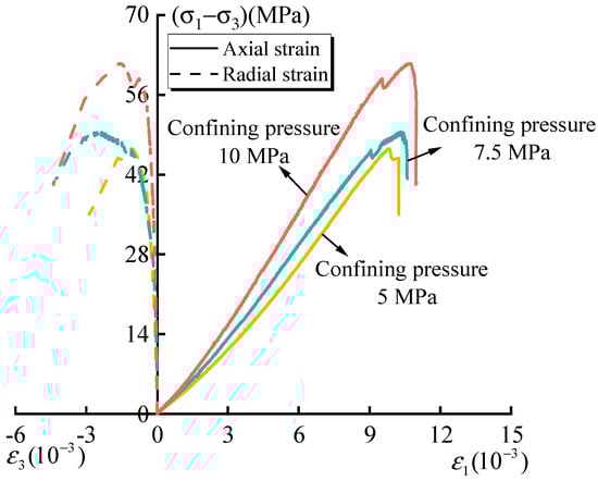 In order to further explore the influence of confining pressure and seepage pressure on the intermittent fractured rock, Figure 5 and Figure 6 show the stress–strain curves of the intermittent fractured rock under different confining pressures and seepage pressures. It can be seen from Figure 5 that under the condition of low confining pressure (confining pressure of 5 MPa), the first stress drop in the fracture sample appears after the stress peak point, and with the increase in confining pressure, the stress drop appears before the peak value. The peak stress and peak strain increase with the increase in confining pressure, and the stress–strain curve is steeper with the increase in confining pressure.
