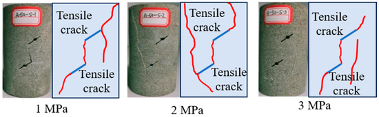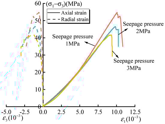 Figure 6 shows the stress–strain curves of the intermittent fractured rock under different seepage pressure conditions. It can be seen from the figure that the peak stress and the peak strain of the fractured specimen decrease with the increase in seepage pressure. At the same time, with the increase in seepage pressure, the secondary bearing capacity of fractured specimens decreases after the first drop of stress. The analysis shows that the permeable gas has a deterioration effect on the fracture sample, promotes crack propagation at the crack tip of the sample, weakens the shear interlocking effect between the fracture surfaces, and makes the fracture sample more easily damaged. For example, when the seepage pressure increases from 1 MPa to 2 MPa and 3 MPa, the peak stress of the rock samples decreases by 18.1% and 23.8%, respectively, and the peak radial deformation increases by 85% and 138%.