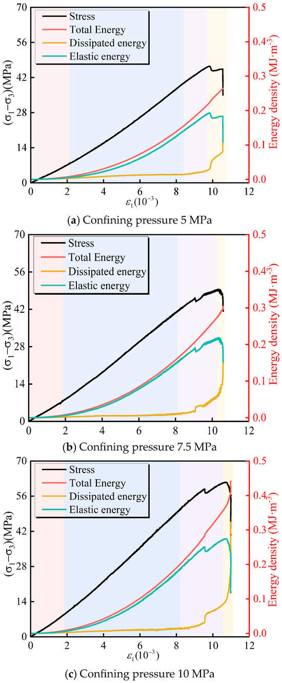 Stress–strain–energy evolution curves under different confining pressure conditions.