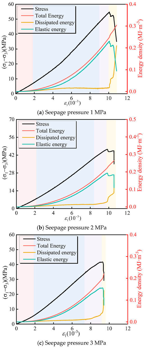 Based on the above energy calculation method, the energy evolution characteristic curves of fractured rock samples under different confining pressures and seepage pressures during loading were obtained. Due to limited space, the energy variation law of the intermittent fractured rock under different confining pressures and seepage pressures is similar. This paper only shows the energy evolution characteristics under the condition of a constant confining pressure of 5 MPa and a constant pressure of 2 MPa.