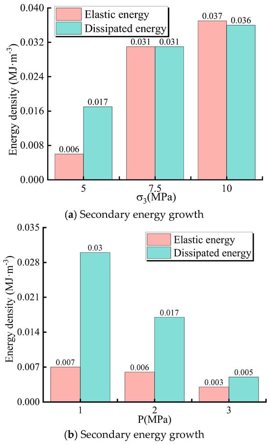 Figure 9 shows the variation trend in elastic energy and dissipation energy with confining pressure and seepage pressure after the first drop in stress. From Figure 9a, it can be seen that when the elastic energy falls for the first time, the secondary load-bearing elastic energy and the dissipated energy consumed by the sample damage increase with the increase in confining pressure. The released energy grows with the rise in confining pressure. For example, when the confining pressure increases from 5 MPa to 10 MPa, the elastic energy and dissipation energy increase from 0.006 and 0.017 MJ·m−3 to 0.037 and 0.036 MJ·m−3, respectively.