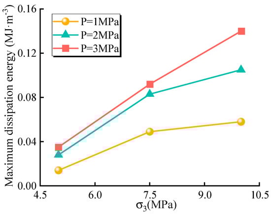 Relationship between maximum dissipated energy and pressure under different confining pressures.