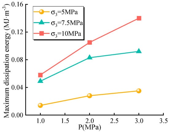 It can be seen from Figure 10 and Figure 11 that under different pressure conditions, the increase in confining pressure causes different degrees of increase in the energy storage limit and maximum dissipation energy of the rock samples. At the initial stage (confining pressure of 5 MPa), the energy storage limit and the maximum dissipation energy of the rock samples are 0.23 MJ·m−3 and 0.014 MJ·m−3, respectively, when the seepage pressure is 1 MPa. When the confining pressure rises to 7.5 MPa and 10 MPa, the energy storage limit and the maximum dissipation energy increase by 0.08% and 250% and by 30% and 314%, respectively. When the seepage pressure is 2 MPa and 3 MPa, it shows the same properties as the seepage pressure of 1 MPa. It is shown that the energy absorbed by the rock mass under high confining pressure is greater than that under low confining pressure. The higher the confining pressure, the stronger the anti-deformation energy of the sample, the greater the energy consumed by the destruction, and the less likely it is to be destroyed.