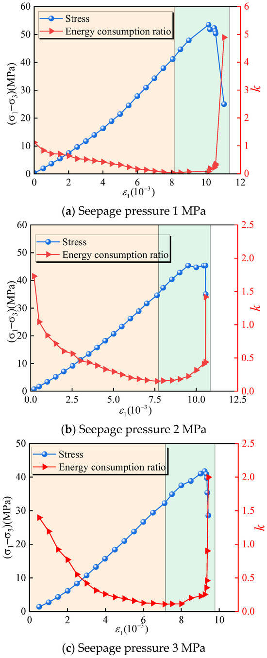 Under the same confining pressure, the higher the seepage pressure, the earlier the ‘inflection point’ appears. As shown in Figure 17, when the seepage pressure increases from 1 MPa to 2 MPa and 3 MPa, the ‘inflection point’ of the energy consumption ratio moves from 8.06 × 10−3 to 7.63 × 10−3 and 7.12 × 10−3, respectively. The main reason is that the gas acts on the crack tip of the rock sample, promotes the development and expansion of the crack, and has a deterioration effect on the rock sample.