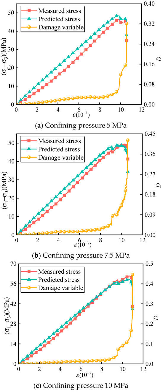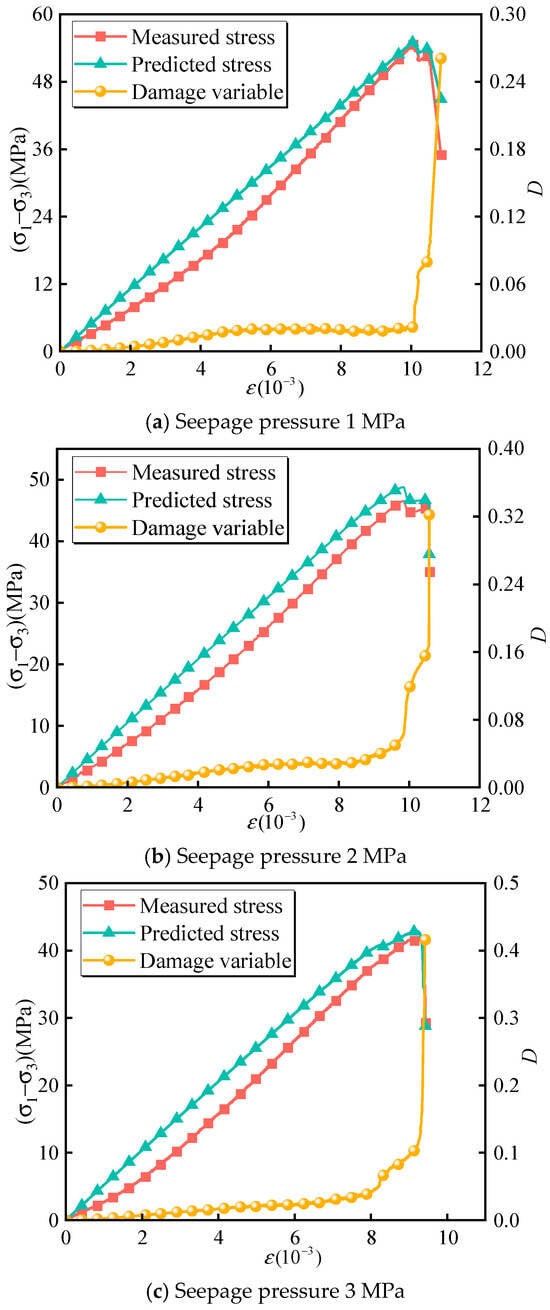Under different seepage pressure conditions, the higher the seepage pressure, the more severe the damage variable evolution. At the same time, it can be found that the curve based on dissipated energy and combined with residual stress characteristics has a higher degree of matching with the measured stress. It shows that the damage variable and damage constitutive equation based on dissipation energy can accurately describe the damage evolution process of intermittent fractured rock under different confining pressures and seepage pressures.