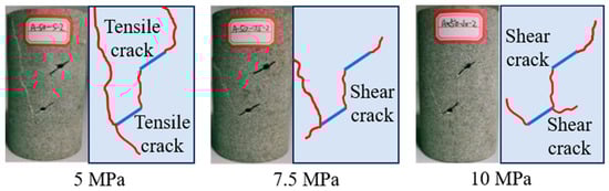 From the perspective of crack propagation, the existence of confining pressure will inhibit the development of tensile cracks and promote the propagation of shear cracks. As a result, the failure mode of the sample transitions from tensile failure to shear failure. On the contrary, the seepage pressure promotes the development of tensile cracks, as shown in Figure 21 and Figure 22.