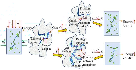 In order to further reveal the microscopic influence mechanism of confining pressure on the fracture samples, it is assumed that the rock material is mainly composed of a variety of different sizes and different shapes of mineral particles bonded to each other. The influence of confining pressure on the fracture sample is mainly reflected in the internal friction and pore closure of the sample. Figure 23 shows a schematic diagram of the microscopic damage mechanism of the specimen under stress–seepage coupling. The crack propagation in the specimen is caused by the dislocation slip of the skeleton and mineral particles under external load. This staggered slip results in friction. With the increase in confining pressure σ3, the contact area and contact force between the particles in the sample increase accordingly. The internal friction force of the sample increases from f1 to f2, and the increase in the internal friction force f of the sample increases the stored energy from U to U + ΔU. The increase in stored energy U makes it show higher bearing capacity and deformation resistance.