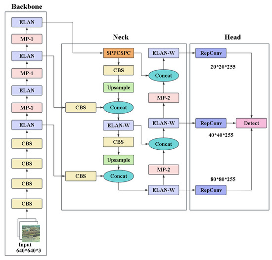 YOLOv7 is an end-to-end target detection model that introduces several optimizations compared to YOLOv5, particularly in the network structure, data augmentation, and activation functions. The specific network structure is shown in Figure 1. YOLOv7 enhances the model’s feature learning capabilities through the introduction of a new network architecture called E-ELAN. This architecture maintains the integrity of gradient paths while optimizing feature extraction and fusion, thereby accelerating model convergence and improving its robustness in handling complex scenes and diverse targets. Additionally, YOLOv7 incorporates RepConv, a re-partitioned convolutional layer [26], in the Head layer of the prediction Head. This adjustment modifies the number of output feature channels, optimizing the computational efficiency and enhancing the model’s expressive power.