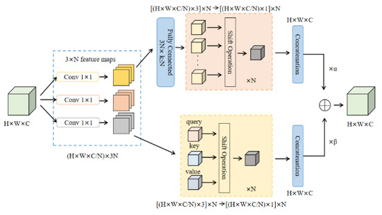 The self-attention mechanism determines the attention weights by dynamically calculating the similarity between relevant pixels using a weighted average operation on the input feature context. This allows the attention module to adaptively focus on different regions, expand its receptive field, and capture more contextual information. As a result, it can more effectively distinguish between the background and the target, capturing more useful features. The computation process can be divided into the following two phases. In the first phase, the input is projected into query and value matrices via 1 × 1 convolutions, with the features transformed into queries, keys, and values. In the second phase, attention weights are computed, and the value matrices are aggregated. For a standard self-attentive module with N heads, the input tensor is , its input tensor is a, and its output tensor is , where H and W denote the height and width, and and are pixels (i, j) corresponding to F and G, and its output computation can be expressed as