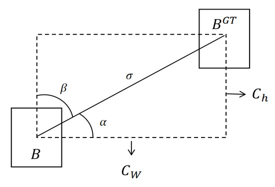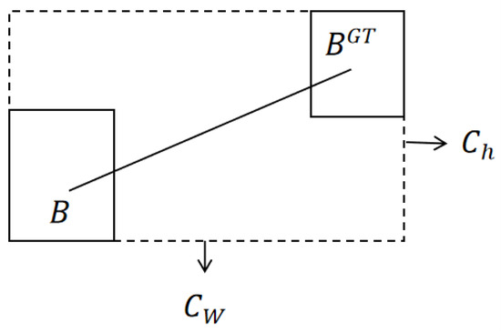 Distance loss is used to measure the distance between the true box and the predicted box. The purpose of the distance loss is to accelerate the convergence and improve the performance by minimizing the normalized distance between the centroids of the two bounding boxes, as defined in Figure 7 and Equation (14) below: