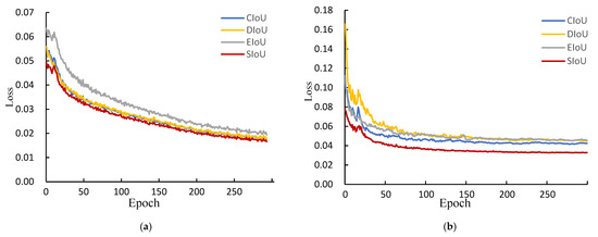 Different IoU loss function curves for the complex background external broken target dataset. (a) Training set; (b) Validation set.