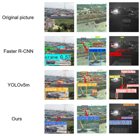 The algorithm proposed in this paper enhances the detection accuracy and reduces the occurrence of false positives and missed detections by improving the model’s long-range dependency and feature fusion capabilities. As shown in Figure 9, the proposed model achieves superior detection performance compared to the other tested models.