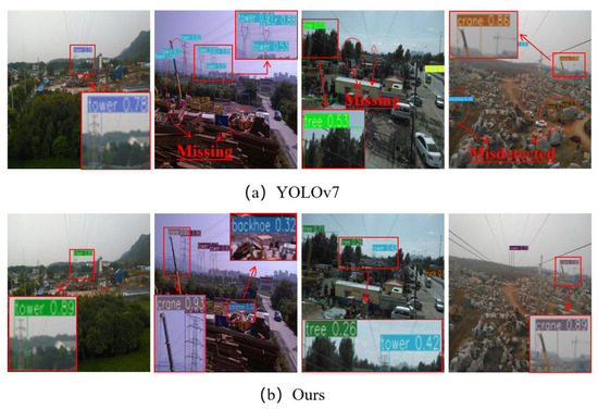 As shown in Table 5, the proposed method achieves an average accuracy of 92.7%, which is 3% higher than the original YOLOv7. Additionally, the number of parameters and computational cost are reduced by 32.3% and 44.9%, respectively, compared to YOLOv7, resulting in optimal overall performance. Although the YOLOv8s model has a slightly lower number of parameters and computational cost than the proposed algorithm, its accuracy is significantly lower. In summary, the improved model presented in this paper demonstrates a faster detection speed and higher accuracy, making it more suitable for deployment on resource-constrained edge devices. This makes it particularly advantageous for industrial applications, supporting the intelligent development of modern transmission line inspection systems.