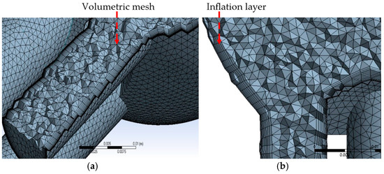 The schematic of finite-volume mesh is presented in Figure 2. The number of cells in the computational domain is equal to 165,264. Unstructured tetrahedral mesh has been used throughout the domain (see Figure 2a). So-called inflation grid layers have been created to form refined structured mesh near the walls of the die to resolve the boundary layer near the die wall (see Figure 2b).