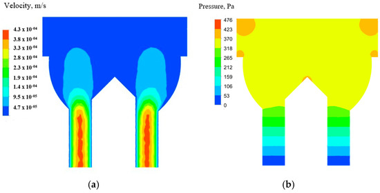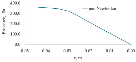 In Figure 10, the pressure distribution is shown inside the die along the flow direction. Within the reservoir, the pressure drop is negligible, whereas inside the outlet pipes, the pressure drop is significant.