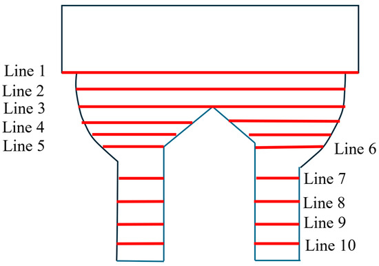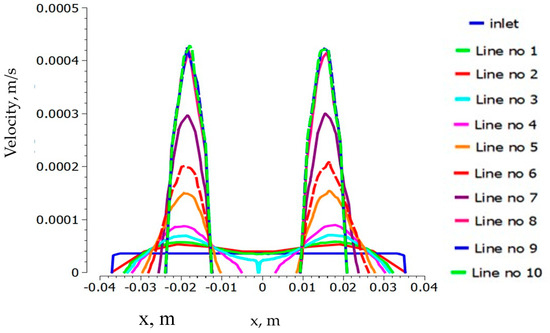 To study the velocity profile at different cross-sectional locations of the die, the velocity profiles are shown along the horizontal lines drawn in Figure 4. In Table 3, numbered lines with their corresponding vertical coordinates are given.