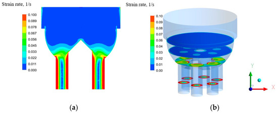 Strain rate (a) at the X-Y plane and (b) at the set of horizontal planes at distances of 0.1 m, 0.3 m, 0.6 m, and 0.7 above the outlet.